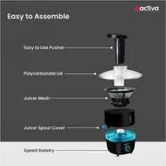 The Activa Juicomatic 600W ABS Black & Blue Juicer Mixer Grinder with 3 Jars from Activa is a powerful and efficient kitchen appliance that will make your daily cooking tasks a breeze. With a power consumption of 600W, this juicer mixer grinder is perfect for grinding, blending, and juicing. The ABS body material ensures durability, while the stainless steel blades make quick work of any ingredient. The Anti-drip Spout Cover prevents spillage and helps in easy cleaning. Upgrade your kitchen with this stylish and functional mixer grinder in black & blue color.