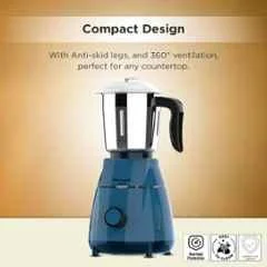 The Butterfly Insta 500W ABS Blue Mixer Grinder with 3 Stainless Steel Jars is a versatile addition to any kitchen. With a powerful 500W motor, this mixer grinder can handle all your grinding and blending needs with ease. The compact design makes it easy to store, while the anti-skid legs ensure stability during use. The 360-degree ventilation system prevents overheating, while the precisely designed blades ensure efficient and uniform grinding. This mixer grinder comes with 3 stainless steel jars, including a 1.5L liquidizing jar, to meet all your cooking needs. It also features multiple speed settings for customized grinding, a robust ABS body for durability, and safety features to prevent motor burnout. The easy-to-clean jars and lids make maintenance hassle-free. Ideal for grinding spices, making pastes, chutneys, and smoothies, this mixer grinder combines performance, convenience, and style. Its sleek design also enhances your kitchen décor. Upgrade your kitchen with the Butterfly Insta Mixer Grinder today!