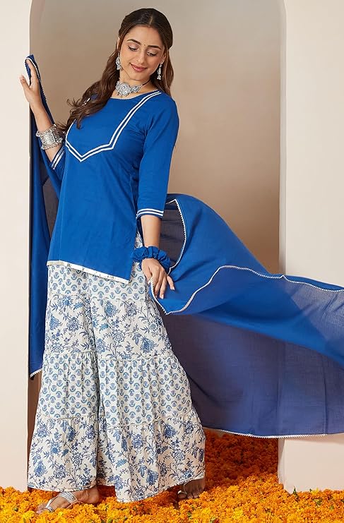- Kurta Color : Blue | Sharara Color : Off White | Dupatta Color : Blue