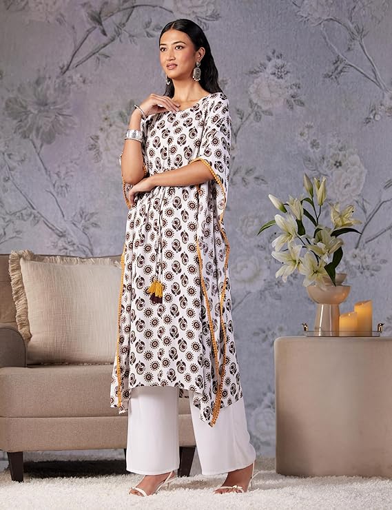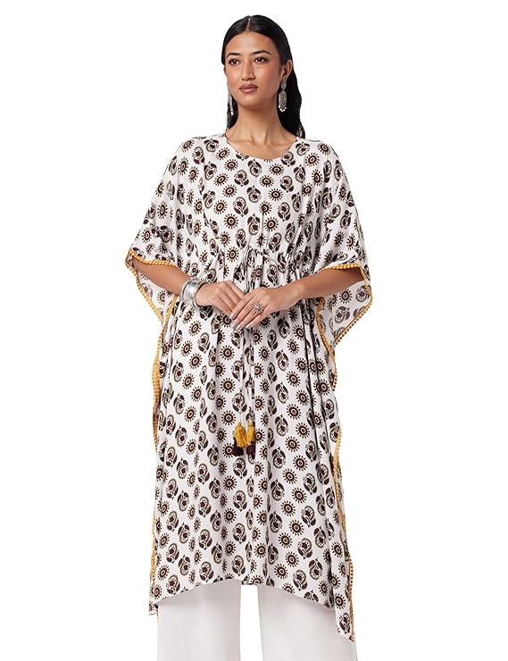 - Revel in the joy of slow days at home in this easy white floral kaftan. Tailored in a roomy, fuss-free silhouette, it features a drawstring waist and a boat neck. Style Tip: Pair it with a statement silver neckpiece for a day out at the beach