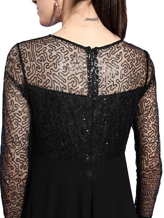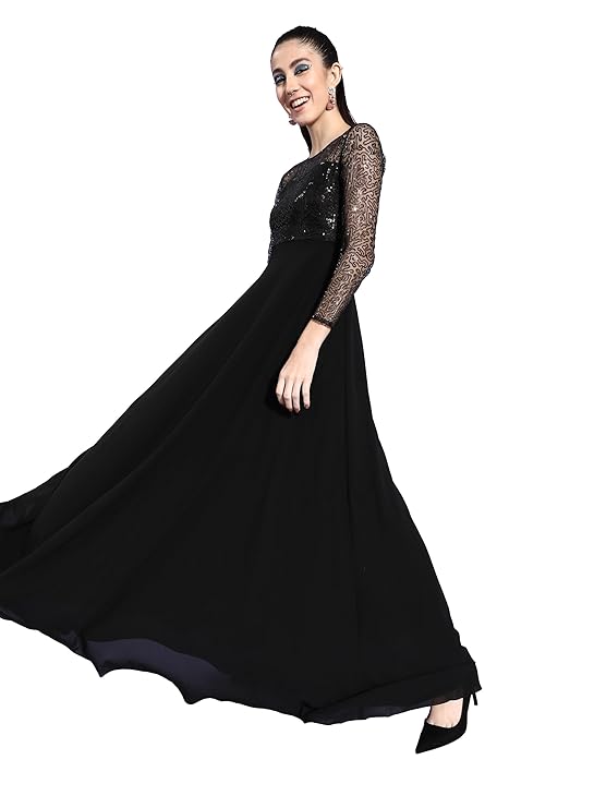 - Style: Embellished | Pattern: Embellished | Fit: Relaxed Fit | Length: Maxi | Closure: Zip | Neck: Round Neck | Sleeves: Full Sleeve