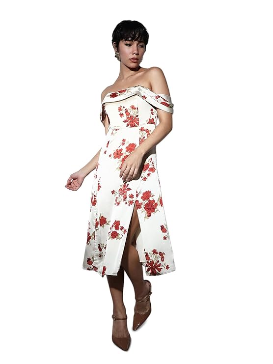 Women’s Floral Print Off-Shoulder Satin Fit & Flare Midi Dress