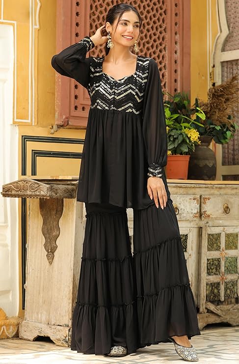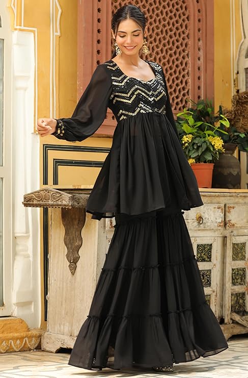 Women’s Georgette Sequined Front Slit Gathered Tunic & Sharara Set