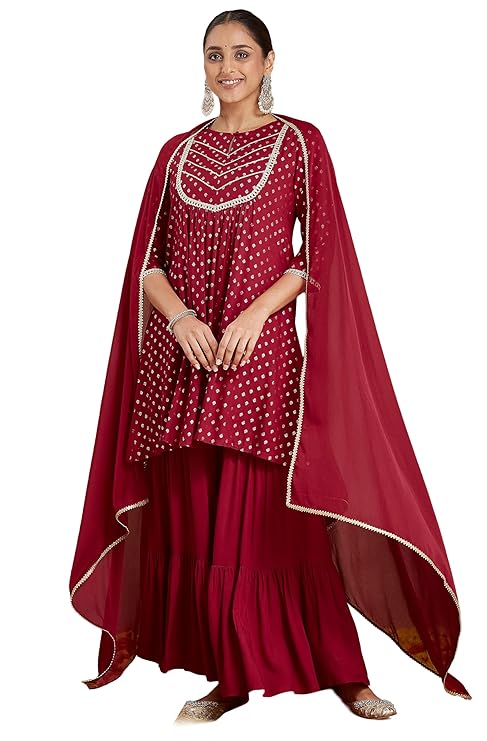 Women’s Maroon Rayon Gold Printed Embellished A-line Kurta with Sharara & Dupatta Set