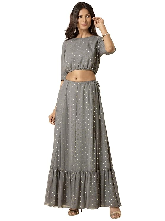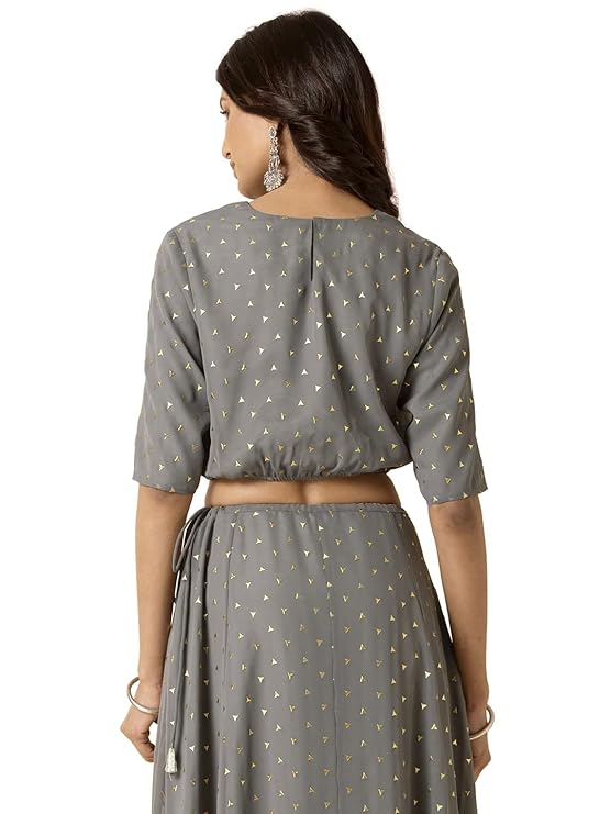 - A classic color and minimal details make this grey crop top from the Payal Singhal for Indya collection an easy to wear & style pick for the festive season. Tailored in a crop silhouette with an elasticated waist, the top features an all-over geometric embossed foil print. Style Tip Pair the top with the grey ruffled skirt from the Payal Singhal for Indya collection.