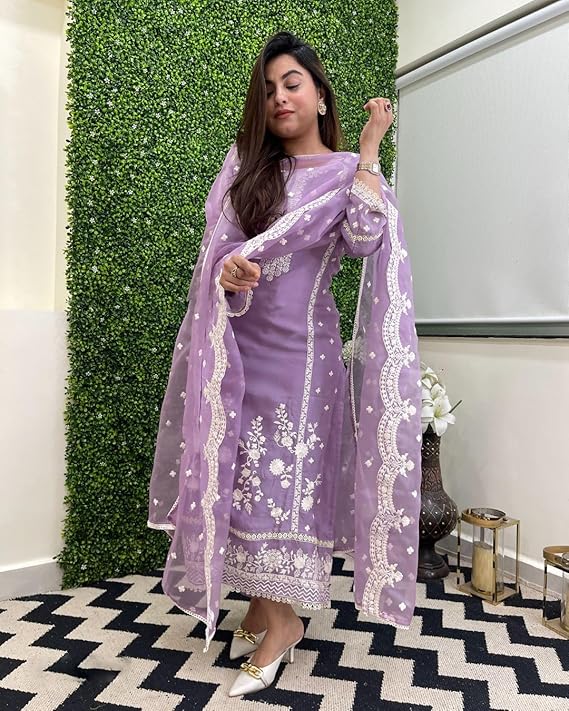 Women’s Rayon Blend Straight Embroidered Kurta with Pant & Dupatta