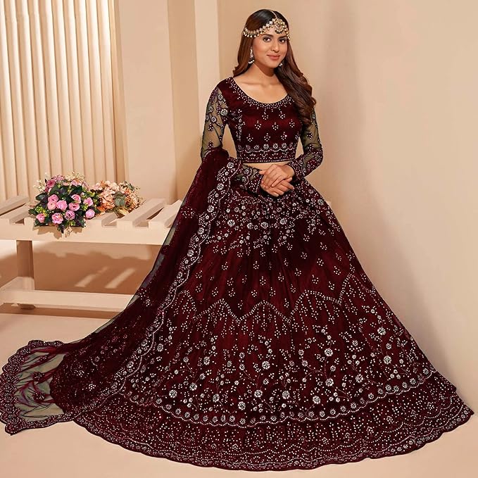 Women’s Semi Stitched Net Lehenga Choli with Embroidered Pattern Unstitched Blouse Piece and Dupatta Set | Women’s Lehenga Cholis
