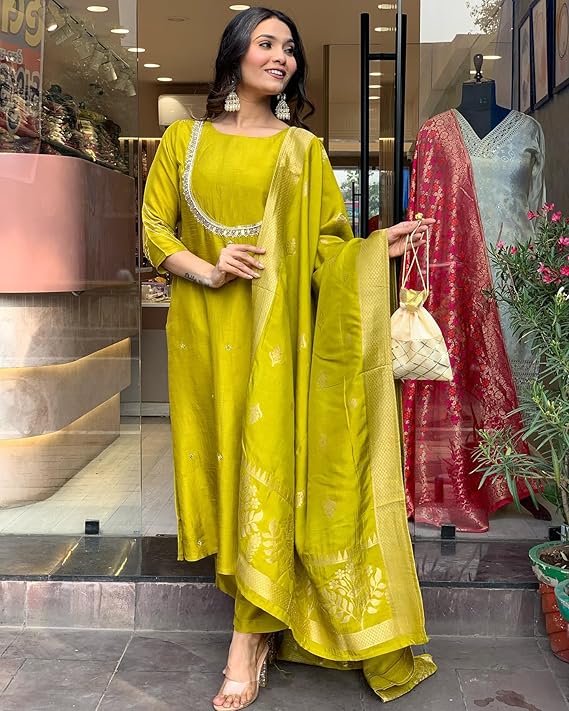 Women’s Silk Blend Straight Embroidered Kurta with Pant & Dupatta