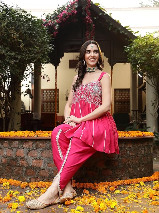 - Pink solid rayon fusion kurti dhoti pant set. kurta has embroidered yoke and gota detailing in bottom with strappy sleeves and solid dhoti pant