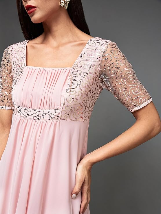 - Style: Pleated | Pattern: Embellished | Fit: Relaxed Fit | Neck: Square Neck | Sleeves: Transparent, Embellished | Closure: Zip | Length: Maxi | Pockets: Yes, 2 Side Pockets