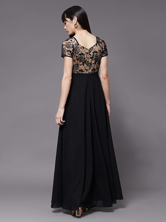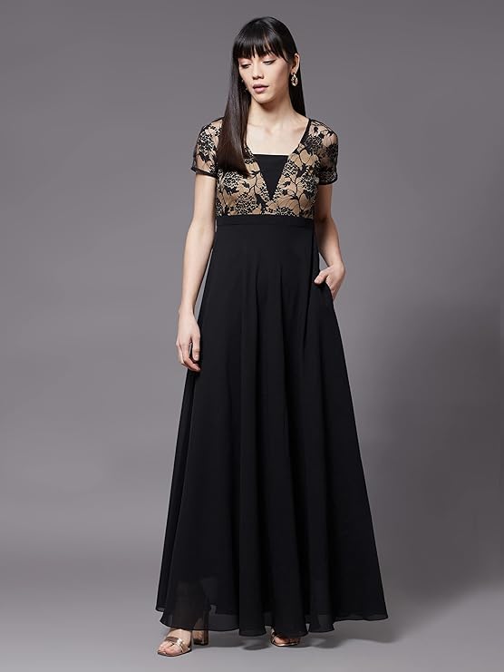 - Style: Lace Overlaid | Pattern: Self Design | Fit: Relaxed Fit | Neck: Square Neck | Length: Maxi | Sleeves: Short Sleeve