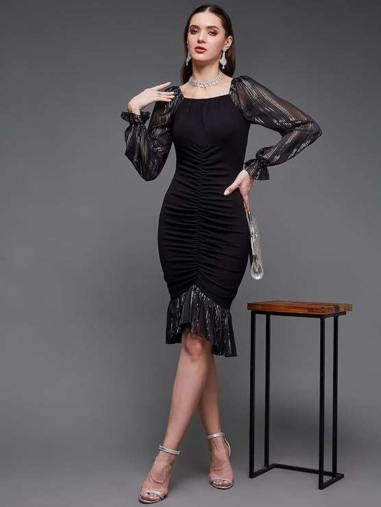 - Style: Bodycon | Fit: Slim Fit | pattern: Stripes | Sleeves: Full Sleeve | Neck: Square Neck | Pockets:No | Closure:Zip | Length: Knee-Long