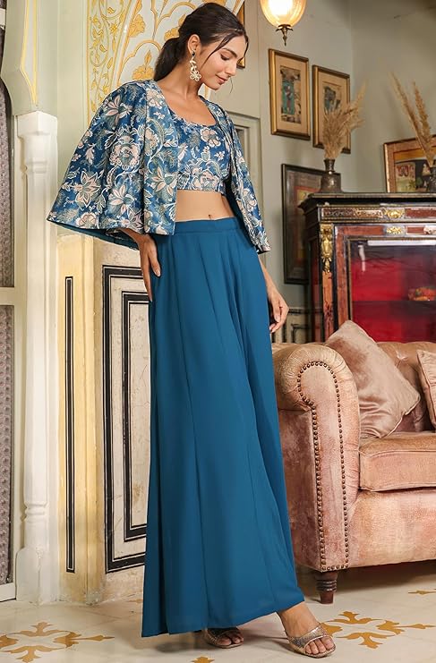 - Crop Top Color : Teal | Palazzo Color : Teal | Cape Color : Teal